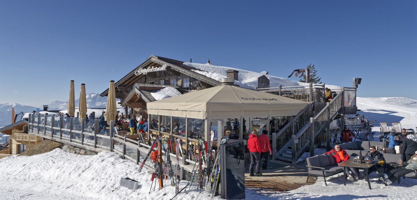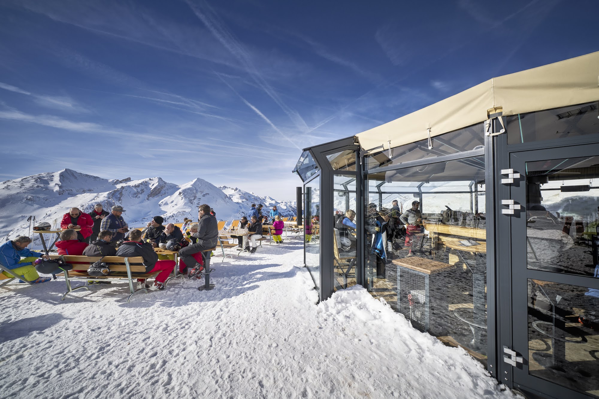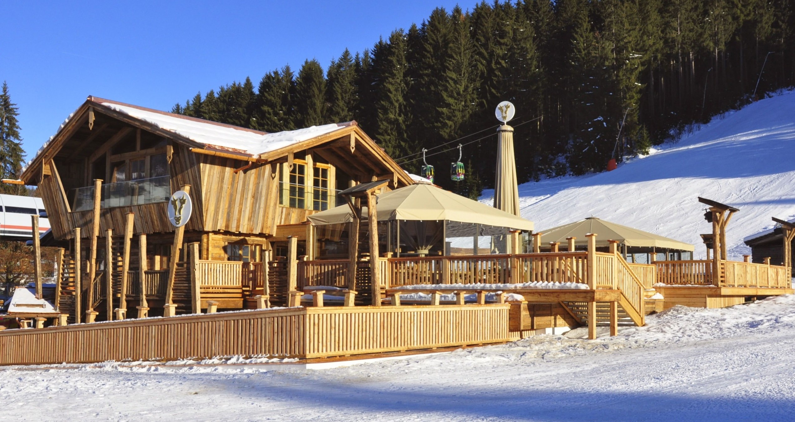 Geiselsberger-Hütte am Kronplatz. 9m / 60m² rundum geschützte Schirmbar.