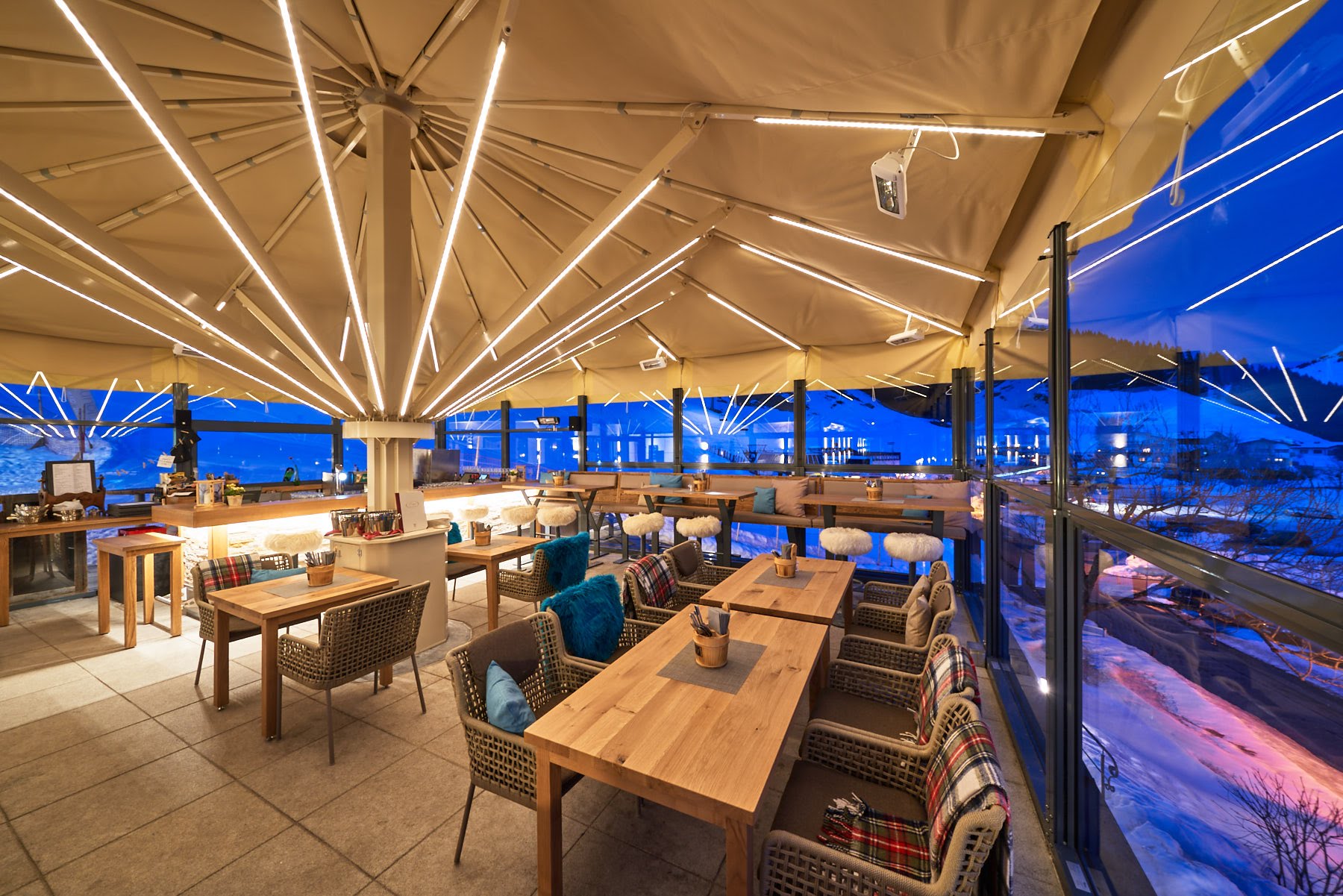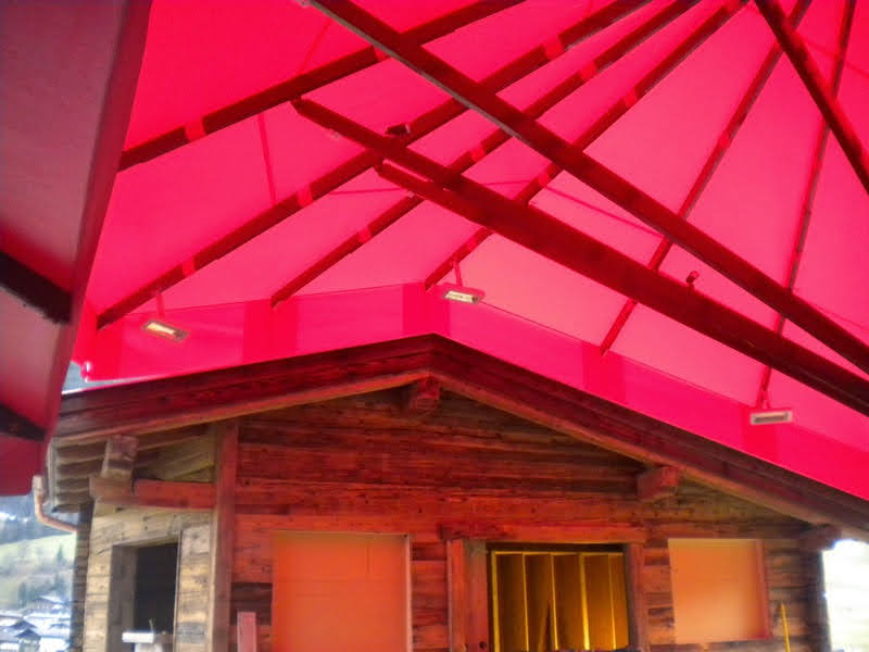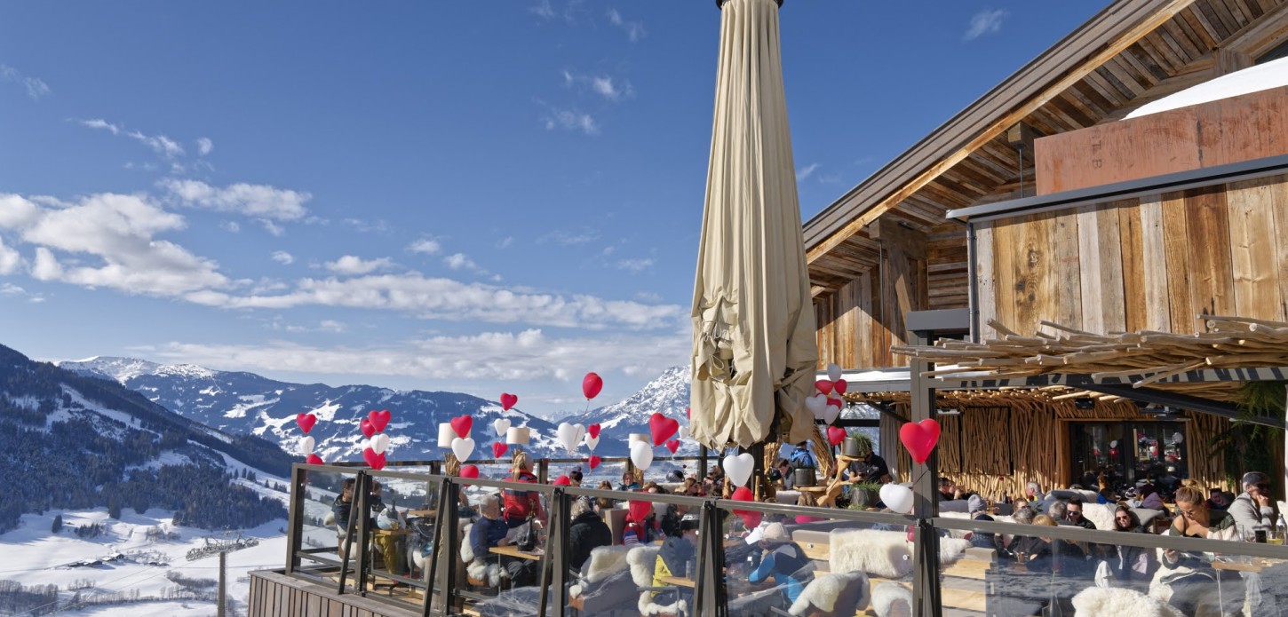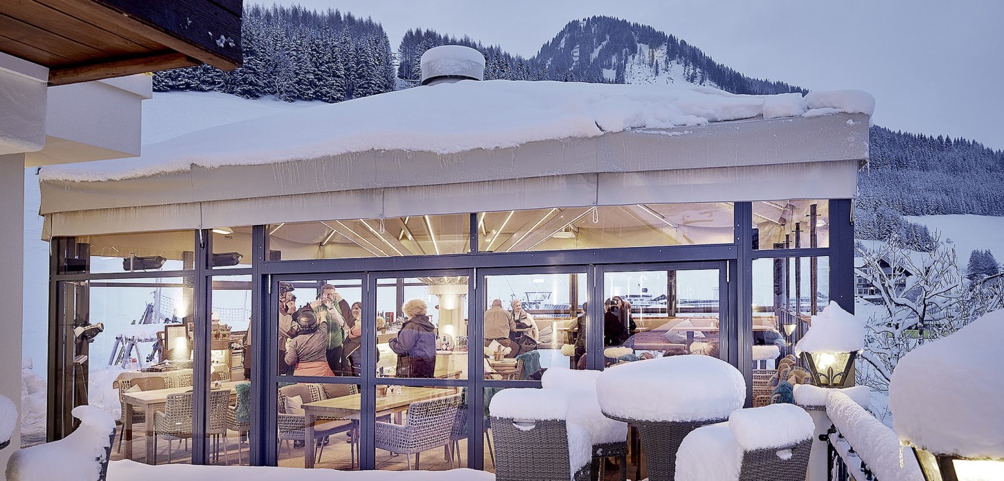 Geiselsberger-Hütte am Kronplatz. 9m / 60m² rundum geschützte Schirmbar.