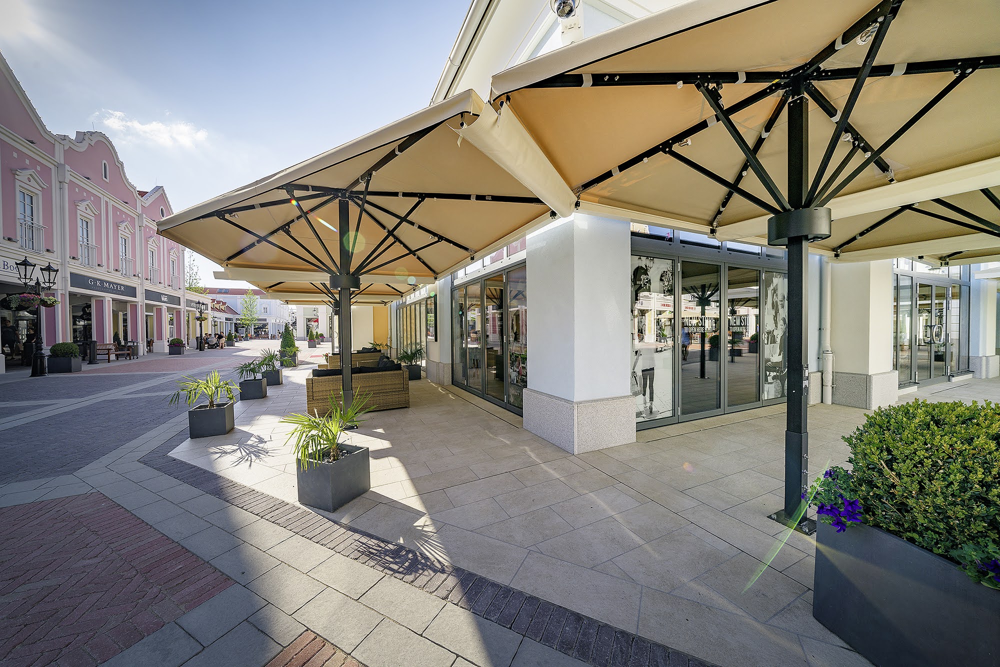 Sonderform-Schirme im Großformat. Bäckerei Gasser am Großen Graben in Brixen