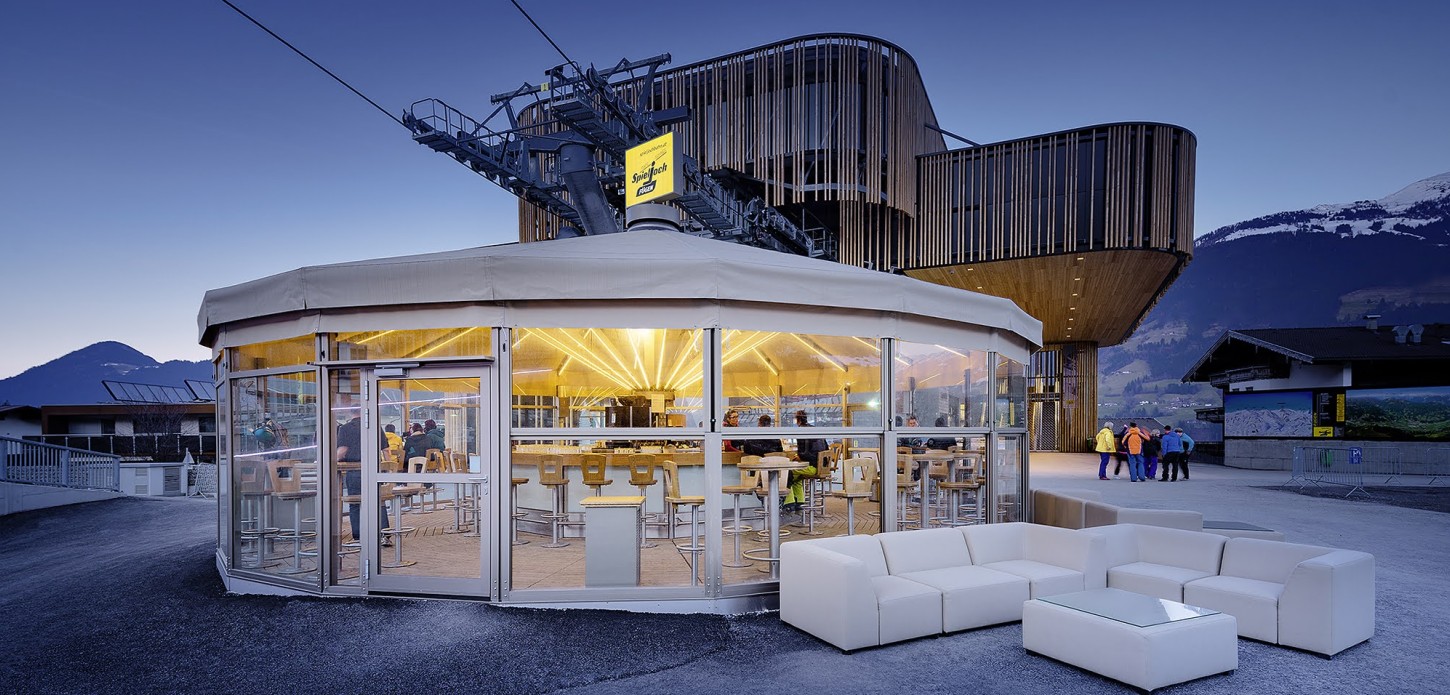 Eine Einkehr bei der Schirmbar darf bei keinem Skitag fehlen. Schlüsselfertig geliefert und voll ausgestattet mit Seitenwänden, Funktionsmöbeln, Bartresen und DJ-Pult ist die Schirmbar zeitgleich Vergnügungszone und Umsatzbringer