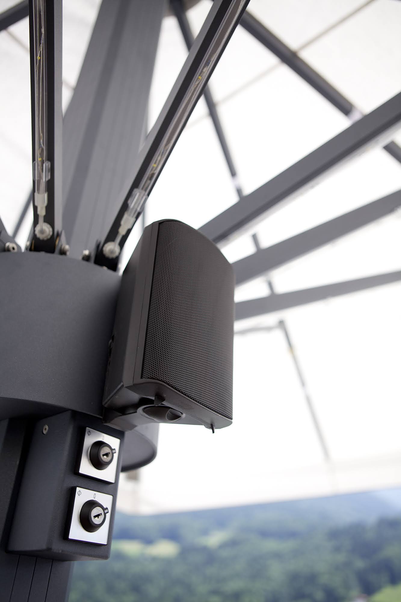 Unsichtbar im Inneren des Schirms verlaufende Verkabelungen erlauben das Anbringen von Musikboxen am Mast und an den Streben