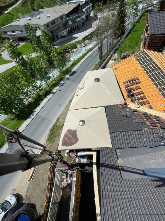 Einzigartiger Sonderform-Schirm für das Gasslbräu in der verwinkelten Altstadt von Klausen